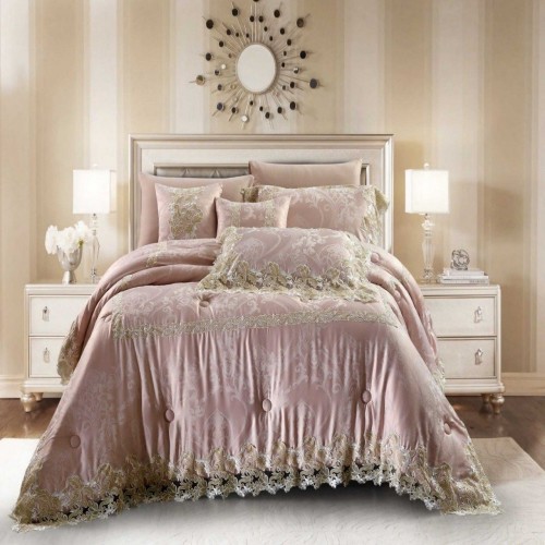 يتكون هدا المفرش من 8 قطع: شرشف، لحاف، كيس خداديه صغير، كيس خداديه كبير، 2 كيس وسادة شام، 2 كيس مخده كبير.